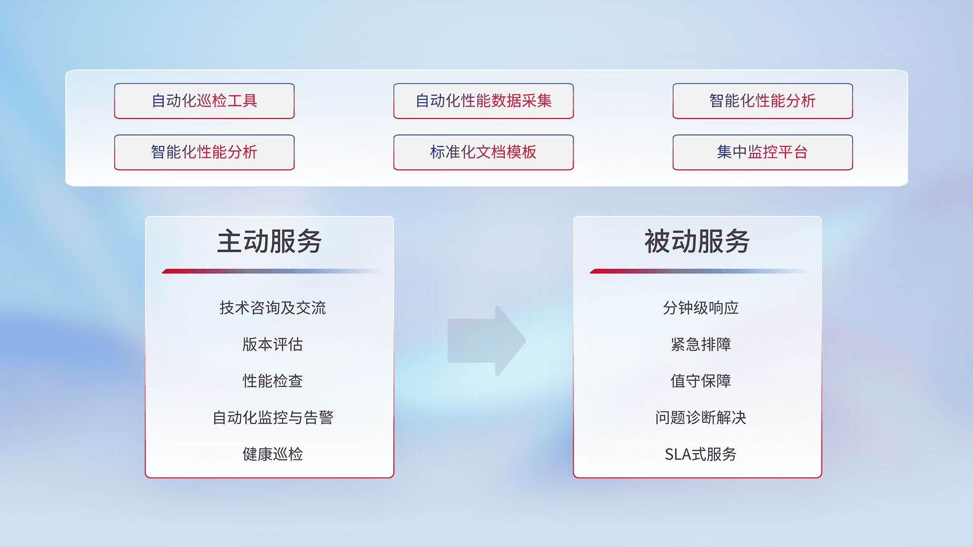 智能化工具和标准化文档,,,保障服务质量,,,提供主动服务(包含技术咨询、、、版本评估、、、性能检查、、、、自动化监控与告警、、、健康巡检)和被动服务包含(分钟级响应、、紧急排障、、、、值守保障、、、、问题诊断解决、、、、SLA服务)。。